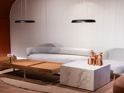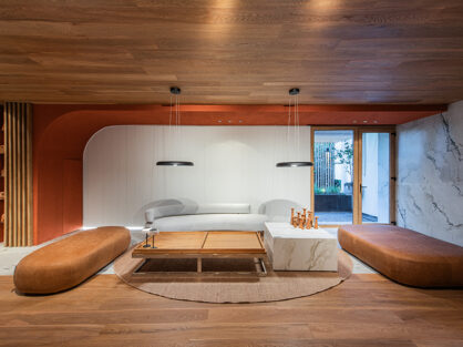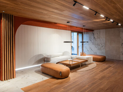 Este contraste resalta cómo los elementos clásicos pueden convivir con el lenguaje contemporáneo, creando un espacio que respeta el pasado pero mira hacia adelante. Los pisos y revestimientos de madera y símil mármol evocan la riqueza de los materiales tradicionales y clásicos, los cuales han sido parte fundamental de la arquitectura patrimonial. El uso de porcelanatos, por otro lado, simboliza la evolución de esos materiales a lo largo del tiempo, adaptándose a las necesidades actuales, pero manteniendo su esencia de elegancia y durabilidad. Los perfiles metálicos actúan como una unión entre los diferentes materiales, creando una simetría moderna que conecta lo antiguo con lo nuevo. Su presencia, además, aporta una textura contemporánea, mientras que su función de ‘conectar’ refleja cómo las tradiciones pueden adaptarse y fusionarse con los avances y las nuevas tendencias de diseño.