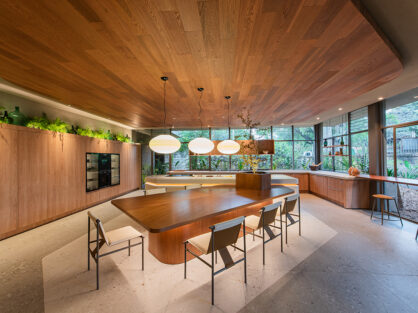 Se concibe como un espacio abierto y luminoso, con líneas limpias y ordenadas que evocan la estética racionalista. A través de envolventes vidriadas el exterior se fusiona con el interior permitiendo que la naturaleza tome protagonismo en la escena.