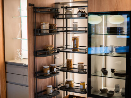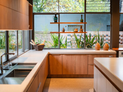 La distribución espacial se organiza en torno a un eje central que conecta las diferentes áreas, adaptándose a las nuevas formas de habitar, facilitando usos y abordando las demandas emergentes. Comprende una isla que alberga la zona de cocción y preparación de alimentos. El equipamiento destinado a guardado, electrodomésticos y otros requerimientos se disponen sobre el perímetro y de forma longitudinal para optimizar la circulación y funcionalidad dentro del espacio.
