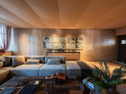 La envolvente del espacio, revestida en arpillera natural, abraza con su textura terrosa y orgánica, evocando la simpleza noble de los telares rústicos y del paisaje sin artificios. En el corazón del ambiente, una gran chimenea oficia de centro y símbolo: calor, reunión, abrigo. Frente a ella, un sofá en L tapizado en una tela acogedora extiende la invitación a la pausa y al descanso, como si esperara al viajero al final del día.