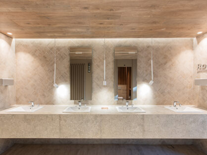 - Boxes privados: Combinacion de materiales con nuevas tecnologias , paneles de melamina RH,resistentes a la absorcin de humedad, techos de madera RH y porcelanatos con tecnología antideslizante.
