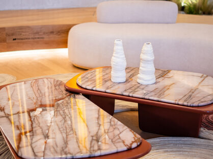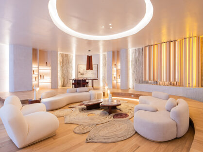 - Área de living, un sector de reunión, al reparo, que abraza. Para generar la sensación de intimidad diseñamos grandes sillones curvos, que envuelven el espacio, entorno a mesas de centro de diferentes formas y alturas y acompañados de sillones individuales, mesas auxiliares y lámparas de pie. Esto permiten diversas interacciones y diferentes formas de apropiación del espacio.
