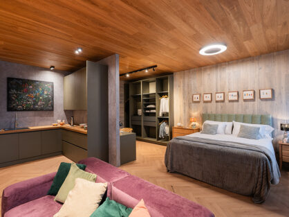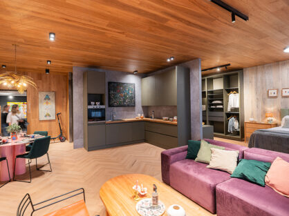 La elección de los materiales responde a una búsqueda sensible: la de crear un espacio que se sienta vivo, que respire con quien lo habita. La madera natural recorre paredes y cielorrasos, envolviendo el ambiente en una calidez orgánica que invita a quedarse, a descalzarse, a bajar el ritmo. El piso, con su elegante trama en herringbone composite, aporta movimiento y sofisticación, una danza de texturas bajo cada paso. Este patrón no solo estructura visualmente el espacio, sino que lo enriquece con una identidad contemporánea que no compite, sino que dialoga con los muros de ladrillo a la vista.