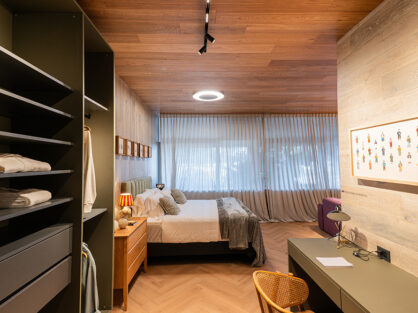 El corazón del espacio es sin duda ese rincón donde cada mañana amanece con la luz filtrándose cálidamente por las ventanas, acompañada del canto sutil de los pájaros urbanos, pequeños milagros cotidianos que el diseño supo respetar. A un lado, un vestidor se transforma también en refugio creativo, con un escritorio pensado para detener el tiempo y dar lugar a la inspiración. El baño, junto con el lavadero, se reviste de tonos piedra, evocando la calma de la naturaleza y cerrando el recorrido con una atmósfera de cuidado y equilibrio.