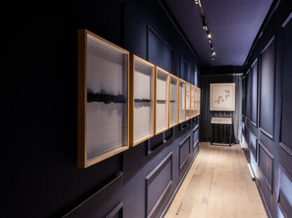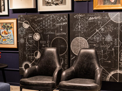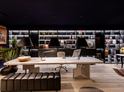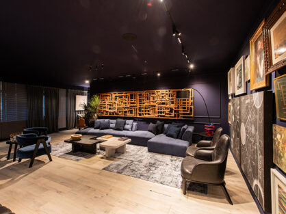 Ingresamos por un canal tamiz para ambientarnos en el uso de este color azul profundo que genera una sensación de paz y relajación y empieza a cobijar de una manera atrapante al arte presente en este estudio perteneciente a un hipotético empresario coleccionista.