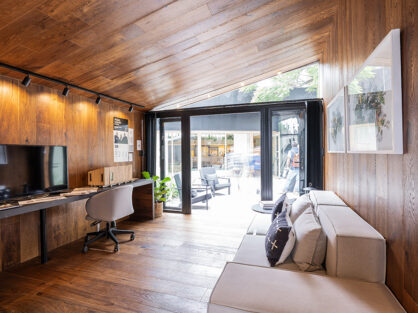 El módulo ha sido concebido como un espacio versátil que responde a las necesidades de trabajo y ocio en un solo ambiente. Su distribución está pensada para optimizar cada metro cuadrado, integrando diferentes funciones con fluidez y confort.