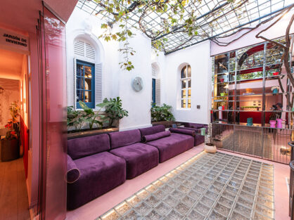 Al ingresar, el visitante es recibido por un sofá protagónico que ocupa casi todo el ancho del espacio. Tapizado en pana color uva, este mueble resuena con la parra que, desde el techo visible, extiende sus ramas y hojas, creando un vínculo orgánico entre el interior y el exterior. Este elemento natural, que ha trascendido el tiempo junto a la arquitectura de la vieja casona, aporta una textura orgánica y un vínculo con la historia del lugar.