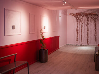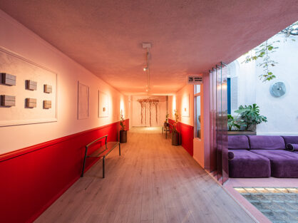 El diseño se extiende más allá del jardín, integrándose con el resto de la casona. Las paredes del pasillo contiguo están pintadas en tonos rojo y rosa pálido, separados por molduras, creando una transición cromática suave hacia el jardín. En el tramo final del pasillo, una instalación de gres modelado emula las ramas de una parra, conectando visualmente con el techo del jardín y simbolizando la continuidad entre interior y exterior.