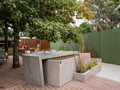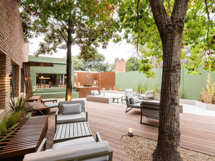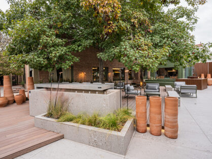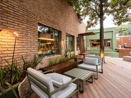 Cada componente fue concebido como una extensión del entorno, creando continuidad entre lo construido y lo natural. Cada pieza no es solo un gesto estético sino elementos que organizan y guían el espacio. Aquí sumamos el recurso del agua, en una fuente que articula el espacio, junto a una barra que sirve de área para disfrutar de una charla, un café… con amigos.