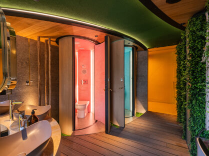 El bloque de baños público busca transcender la función de servicio sanitario para convertirse en una experiencia arquitectónica integrada al entorno próximo.