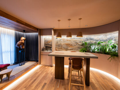 El espacio de reunión/comedor incorpora una barra multifuncional, ideal para reuniones informales y comidas en un ambiente relajado. El diseño se integra en un mueble versátil que ofrece almacenaje personal y alberga un pulmón verde en su centro.