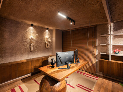 fomentando el descanso y la relajación. Por otro, la oficina, concebida para separar claramente las actividades laborales del esparcimiento, garantizando un entorno que favorezca el equilibrio físico, mental e intelectual. Esta separación permite que cada