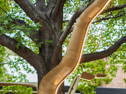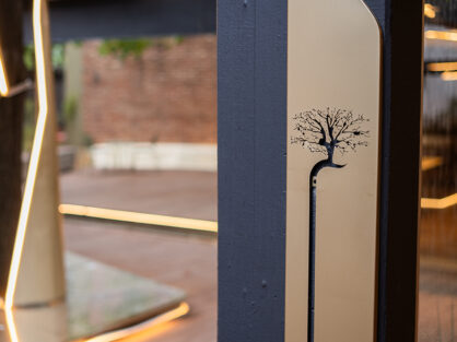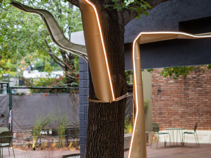 Al igual que un árbol que nace de una semilla y con el tiempo se convierte en el hábitat de múltiples especies, este espacio busca ser un lugar de encuentro, pausa e interacción con la naturaleza. La experiencia comienza con una conexión sensorial y experimental, invitando a descubrir lo natural y el patrimonio. Desde el ingreso, el árbol existente en el centro recibe al visitante y se percibe como un ícono y punto focal, generando un juego de luces y sombras a través de sus ramas y follaje. A partir de ahí, se inicia un recorrido por el espacio exterior, guiado por una línea de tiempo que narra la historia y evolución del lugar. Este trayecto mantiene un contacto directo con la biblioteca de carácter patrimonial y está marcado por pequeñas pausas que permiten aprender sobre el pasado y el futuro, mientras se experimenta la conexión con la naturaleza a través del sonido y el fluir del agua, evocando las antiguas acequias de Argüello y la vegetación como soporte natural. En este patio interior, los elementos se integran para crear una atmósfera acogedora, amigable e introspectiva. Así como el árbol recibe al visitante, también marca el inicio del recorrido hacia los siguientes espacios. Sus ramas se extienden en altura hacia el pórtico de ingreso, conformando el cielorraso interior y generando una sensación de continuidad y síntesis, destacando lo natural como la esencia del proyecto. Este concepto se complementa con espejos estratégicamente ubicados, que reflejan el patio y amplifican su escala, permitiendo al visitante percibir el paisaje que deja atrás y anunciando el paso hacia los siguientes espacios para experimentar otras vivencias.