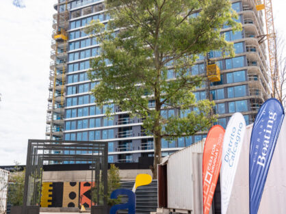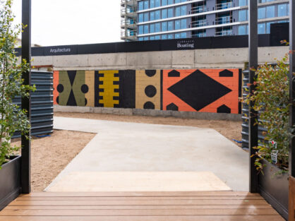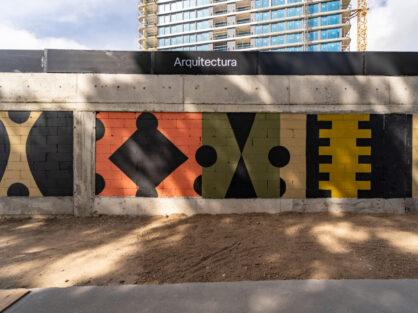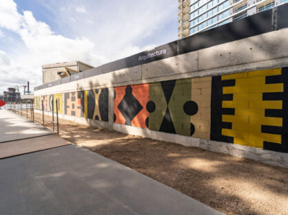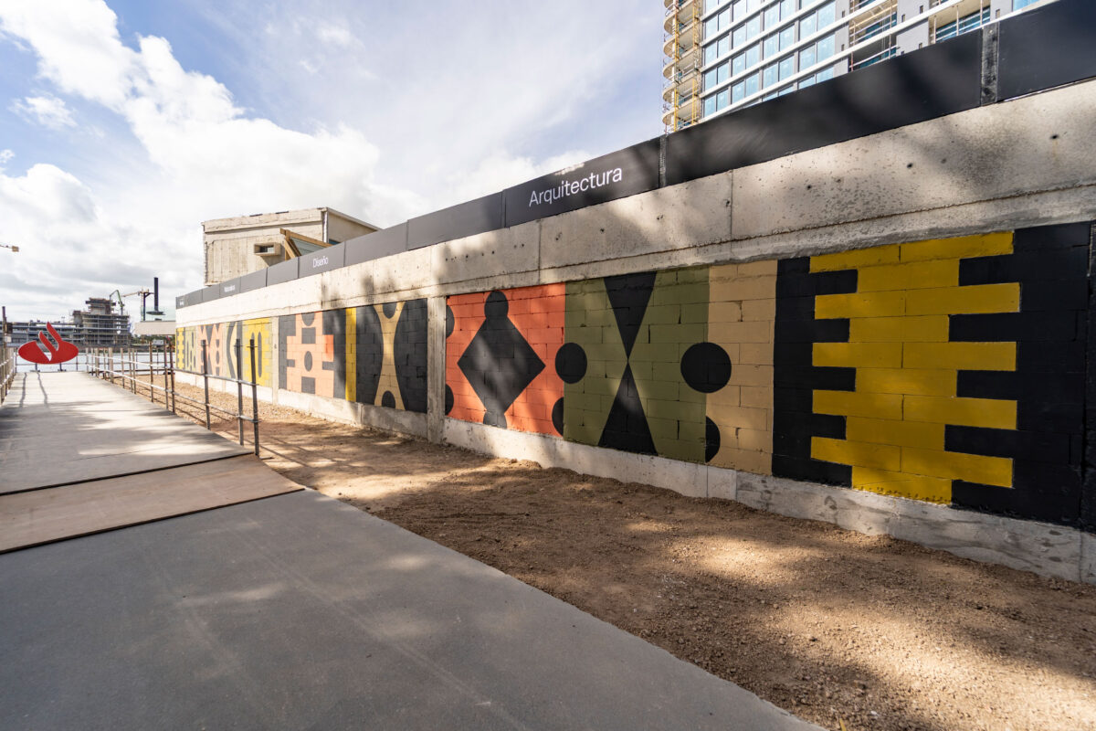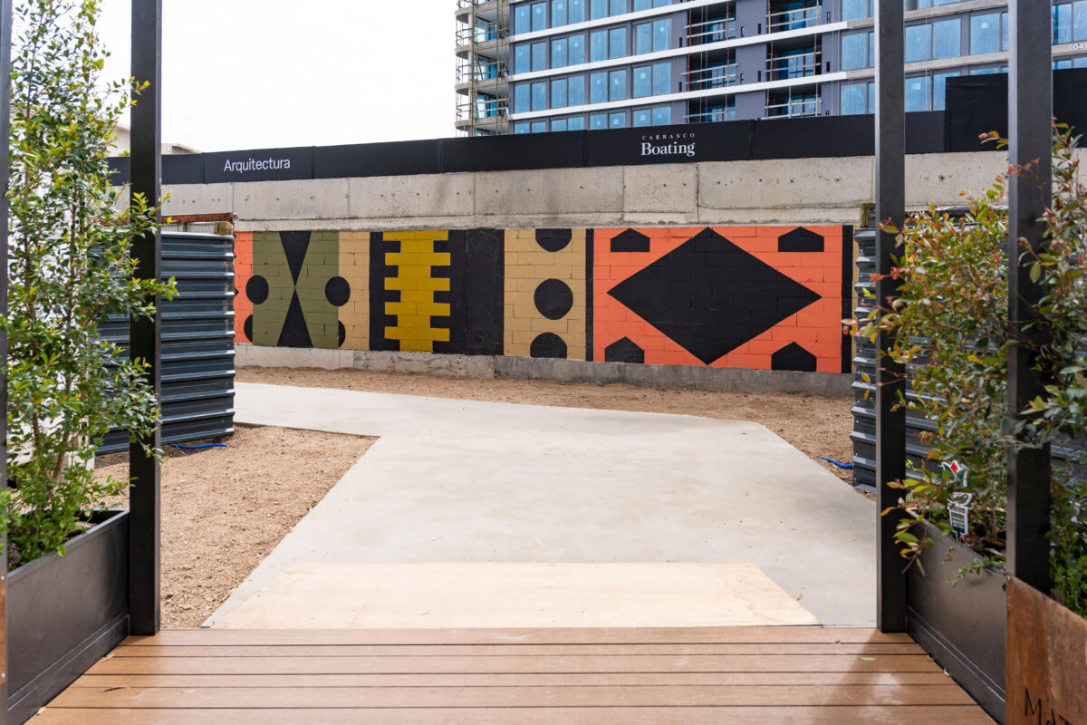 Elegí un diseño geométrico para que mantenga la misma identidad que la pared de bloques, figuras simples y limpias con una estética moderna. Use una  combinación de colores tierra predominando el negro y resaltando el color coral para generar impacto visual.