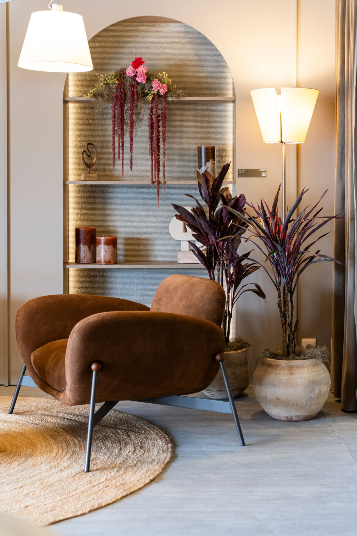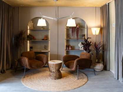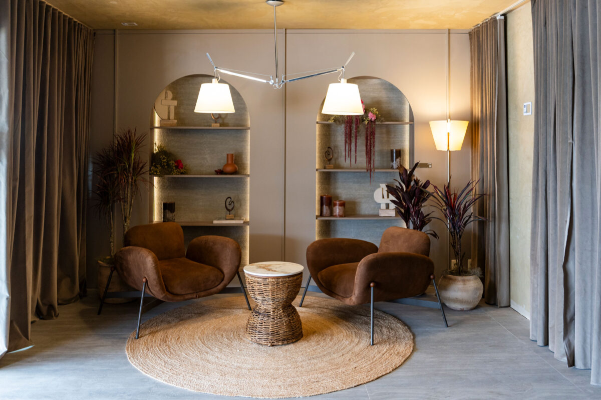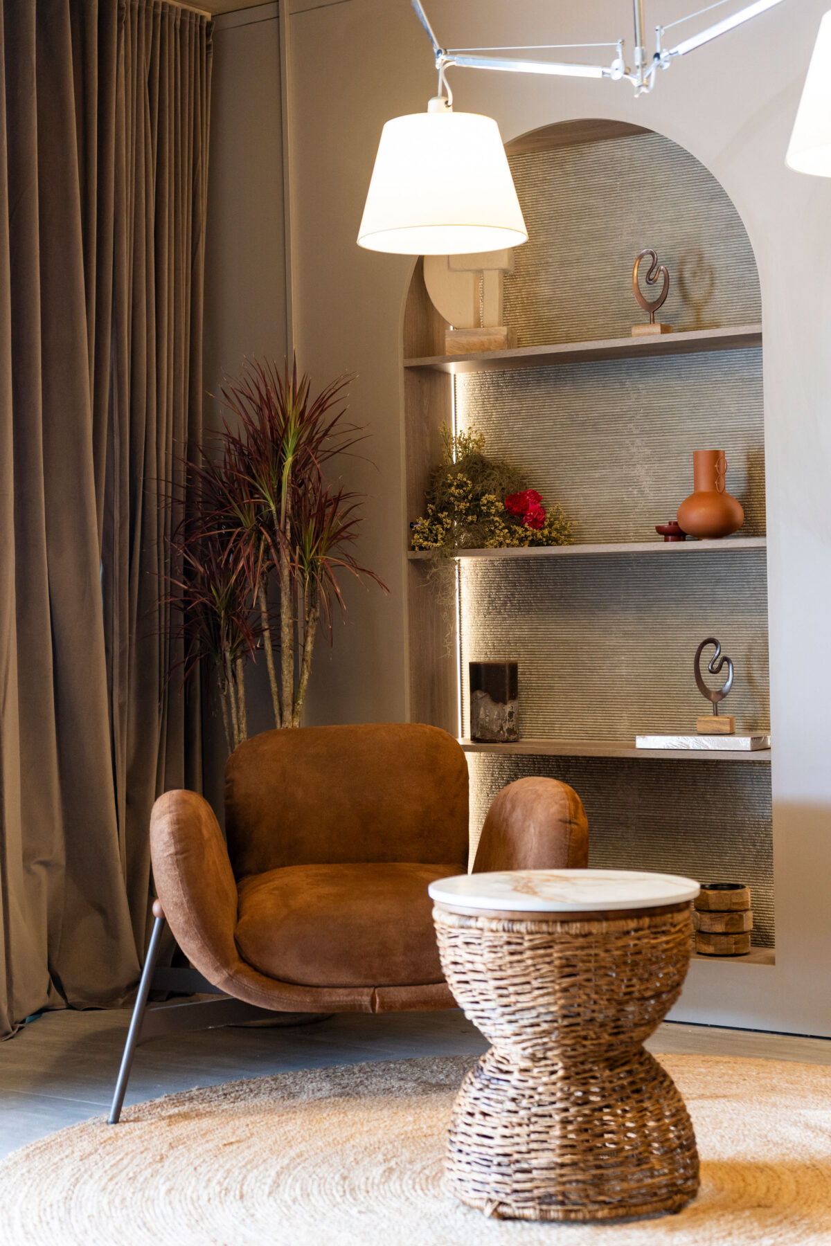 El estudio – concebido para entrevistas a diseñadores – propone una atmósfera contenida, donde la materialidad define el relato. Maderas, textiles y superficies pétreas crean un entorno cálido y táctil que invita a la pausa y a la escucha.