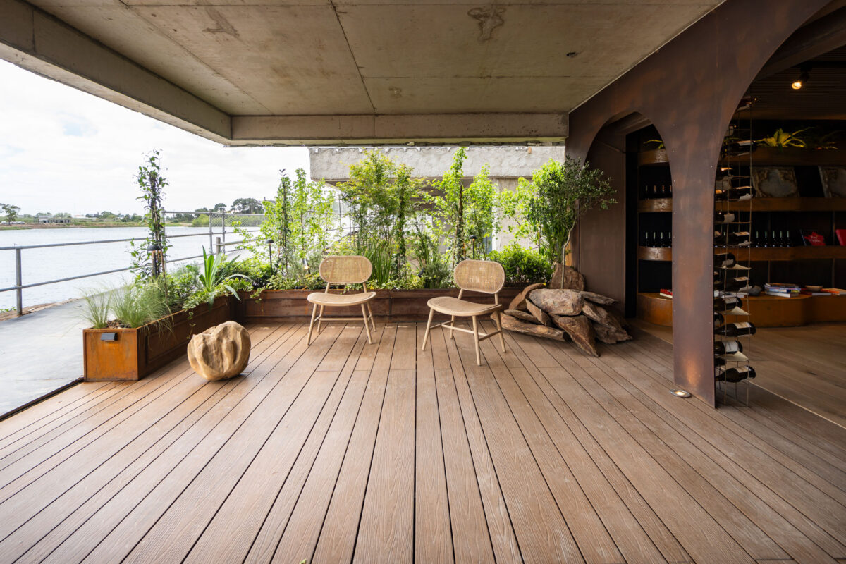 Dentro del espacio, el revestimiento Élite tono Ebony aporta una textura sobria y lavable, instalado sobre perfilería metálica con clips de aluminio. En el cielorraso, el panel acústico Sonowood suma calidez y confort auditivo. Las arcadas en acero corten integran los ambientes, conectando con una terraza de 30 m² delimitada por maceteros con vegetación exuberante e iluminada con vista al lago.