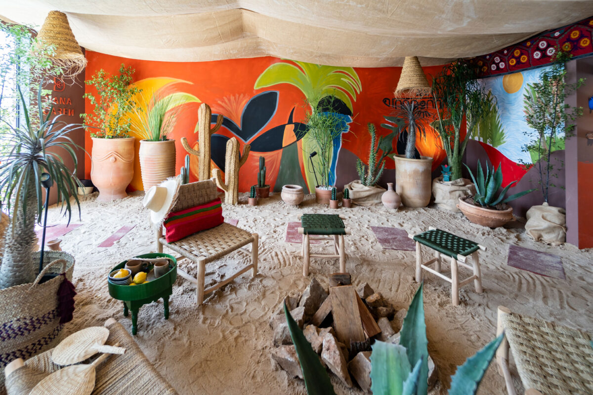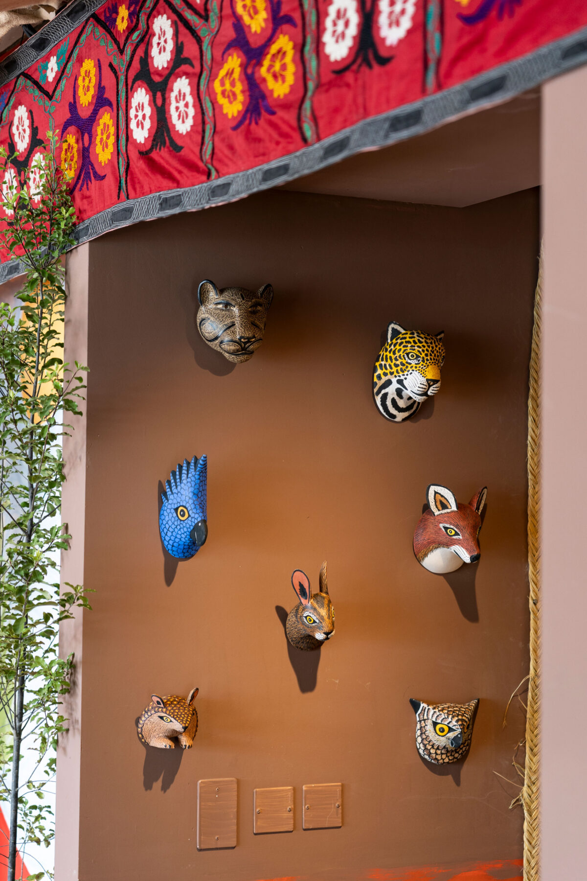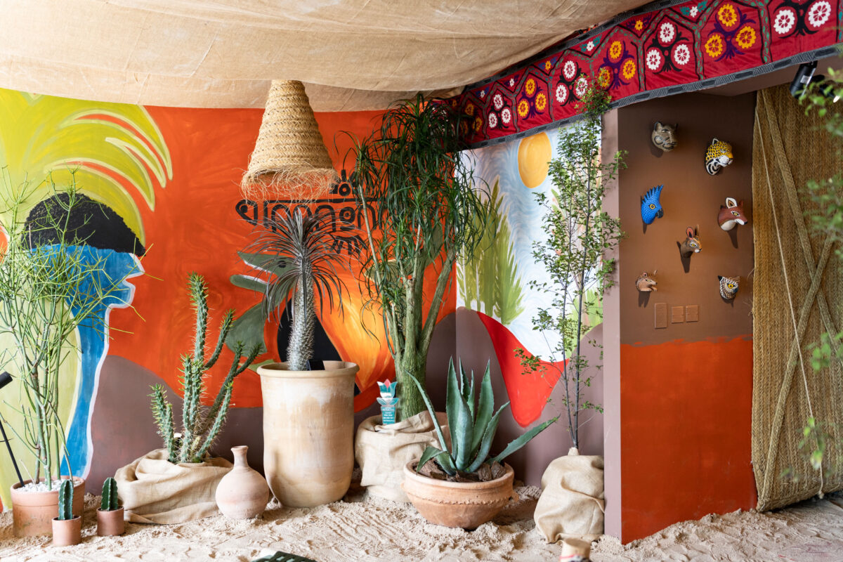 Un mural en tonos tierra y matices aztecas refleja la identidad cultural, mientras la exuberancia de las hojas y los cactus retrae el paisaje mexicano desde una mirada contemporánea, donde lo rústico y lo salvaje conviven en armonía.