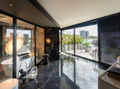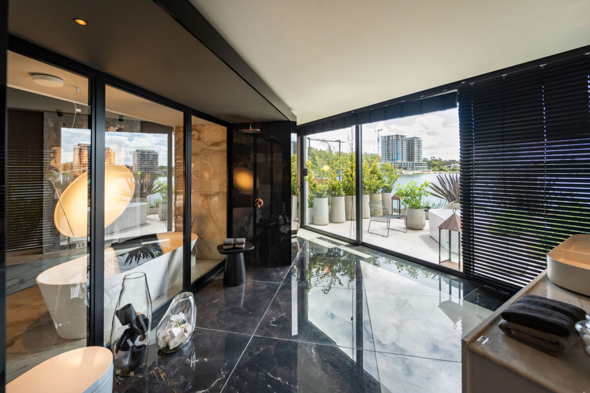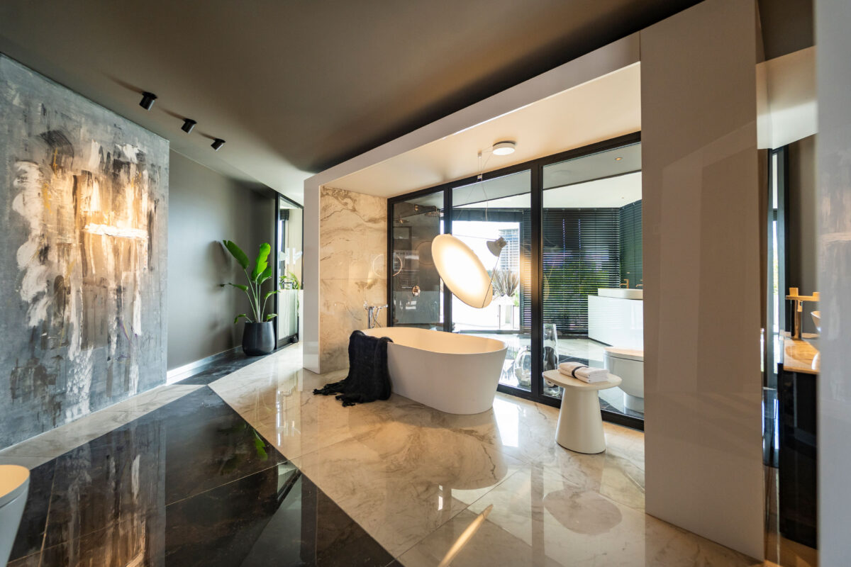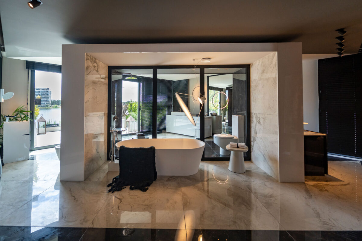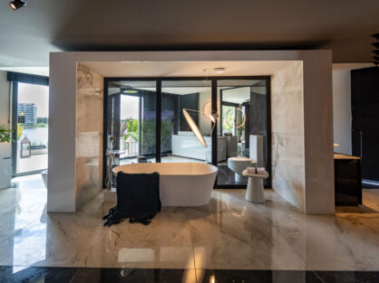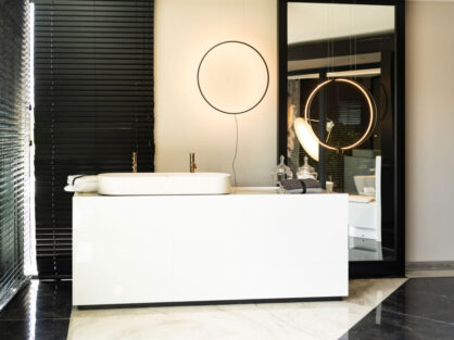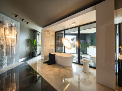 Un pórtico central se impone por su forma, su escala y su geometría caprichosa en dos tonos. Transparencias y reflejos dialogan entre sí, construyendo pequeños rincones que invitan a imaginar el placer de un baño o el ritual cotidiano de quitarse el maquillaje.