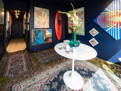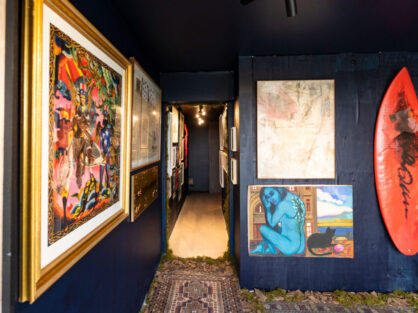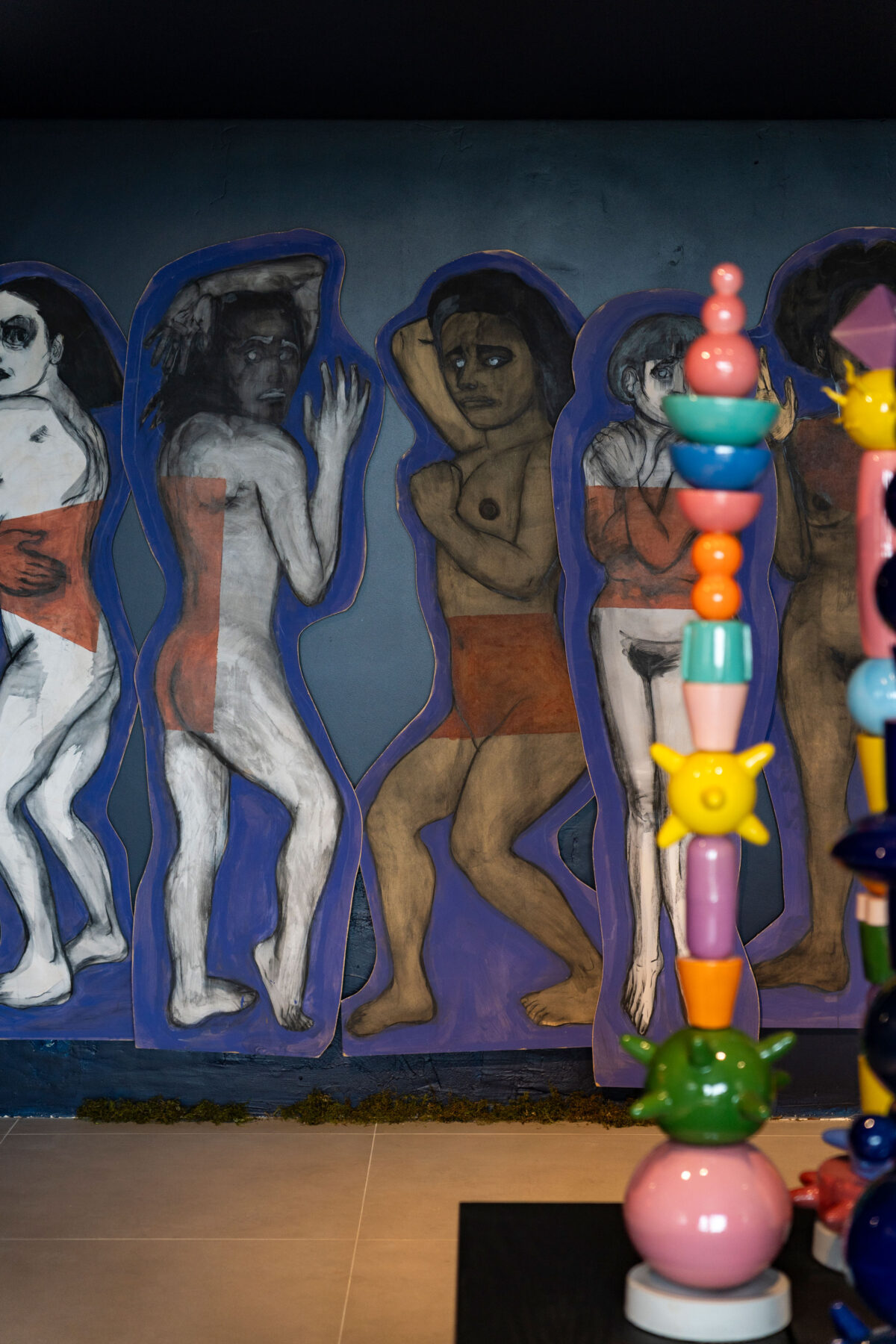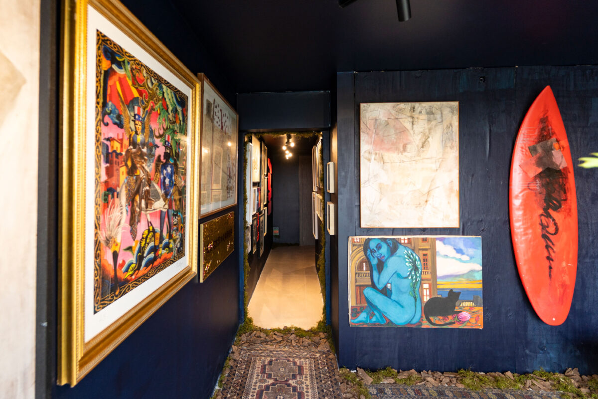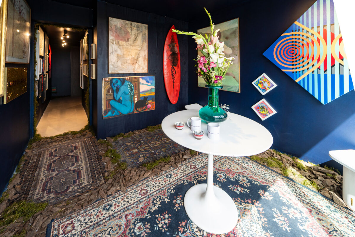 Obras de arte y objetos se integran en una atmósfera azul profundo, donde la elegancia convive con la fuerza de lo instintivo.