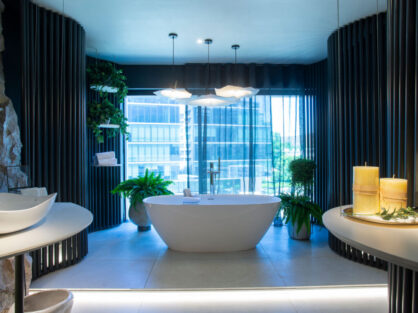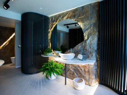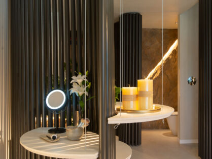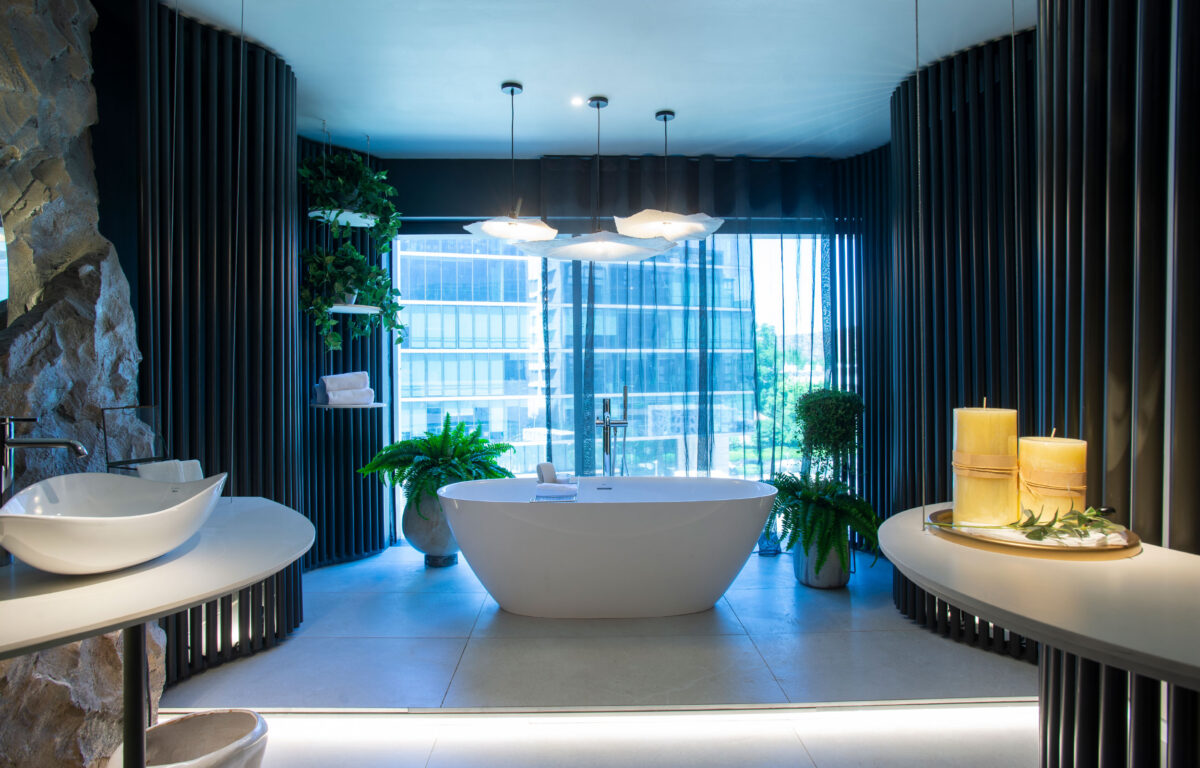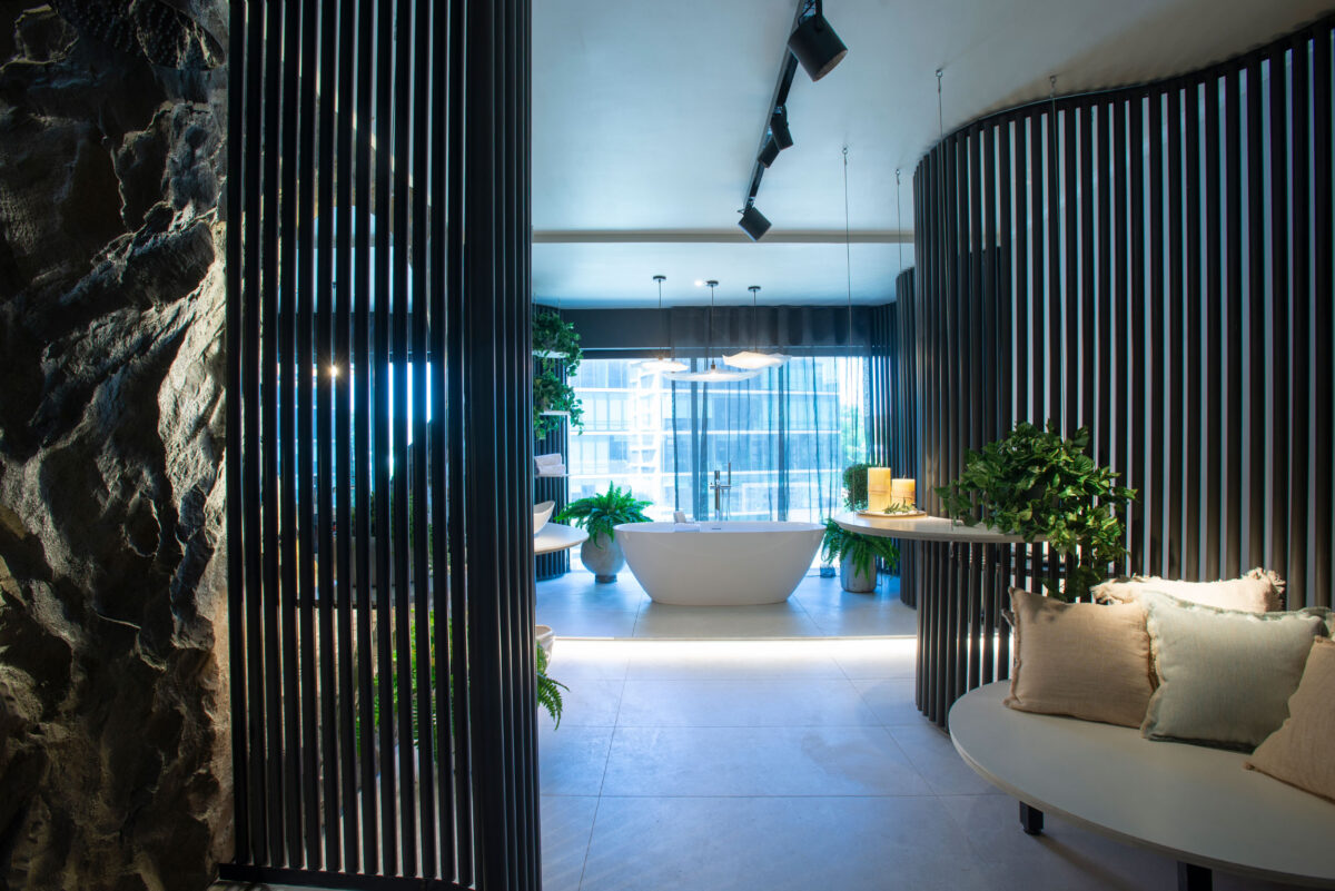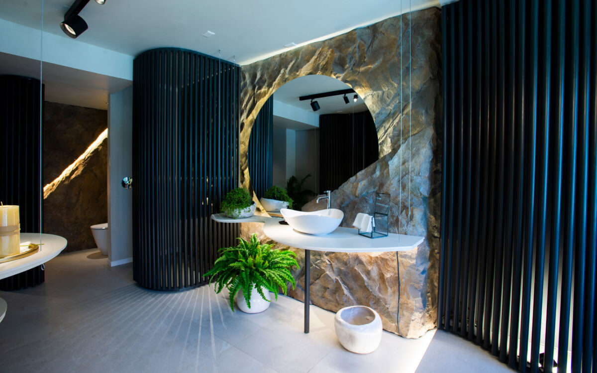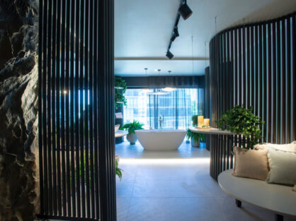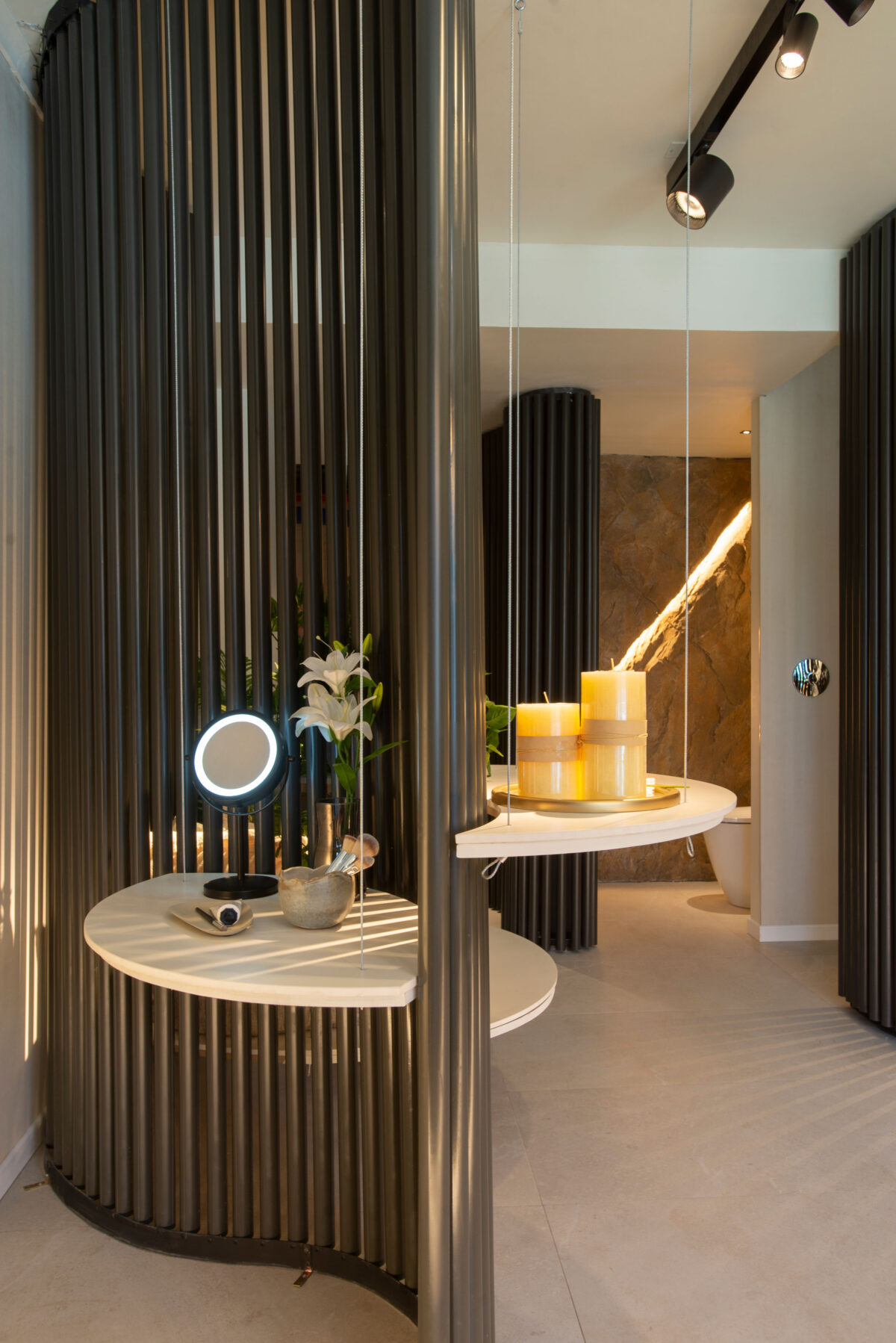 Sala de baño moderna y de lujo, combinando elementos naturales con toques industriales y formas curvas. El espacio está dominado con perfiles verticales, utilizados como celosía y dando una sensación de más altura y transparencia