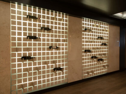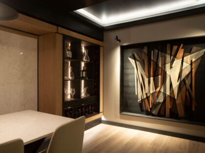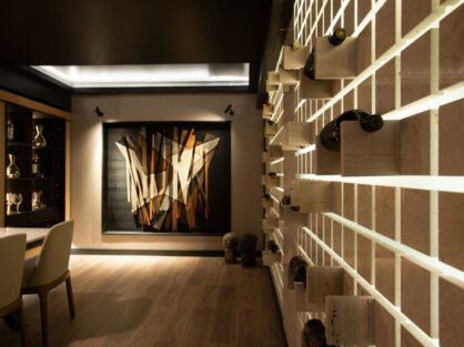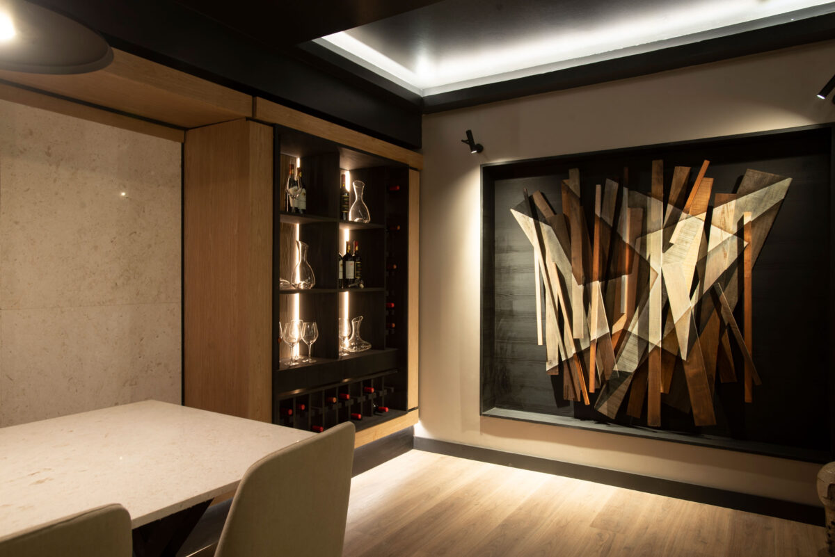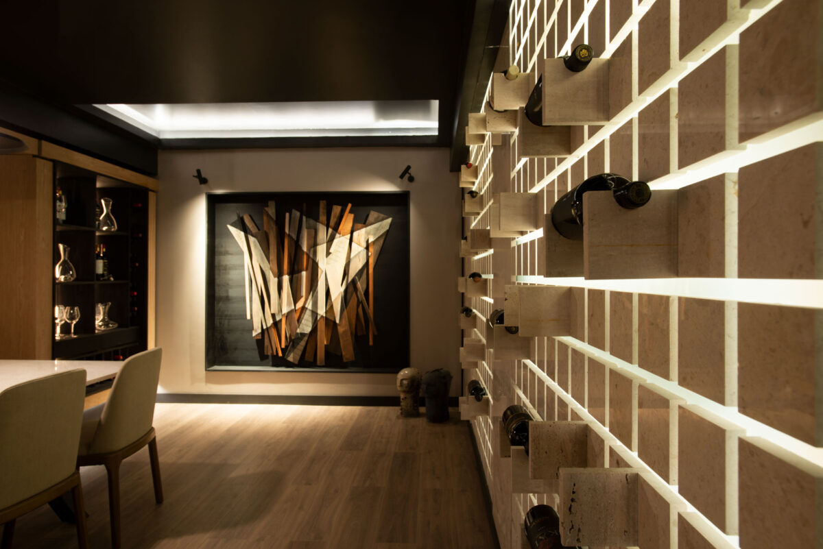 Las botellas, verdaderas custodias del tiempo y la memoria líquida, se integran tanto en los muros como en un noble mueble lateral que culmina en una obra de arte de Beatrice di Girolamo en madera reciclada, recordando que toda materia puede renacer. Los materiales son esenciales y honestos: piedra, madera y vidrio, en tonos naturales y sin artificios, enalteciendo la verdad de la materia y su origen elemental.