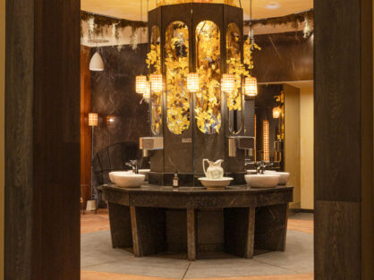 Al ingresar, columnas decoradas con líquenes y cuadros enmarcan la experiencia, invitando a descubrir el espacio con una sorpresa delicada. Fotografías de antiguos baños públicos, en tonos sepia, conectan el pasado con el presente, sumergiendo al visitante en una narrativa sutil.