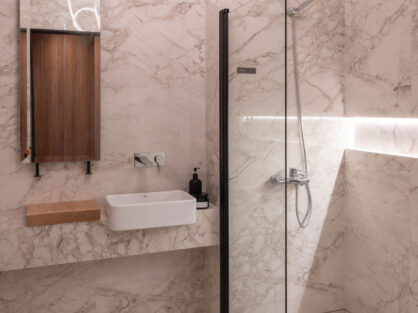 Se tuvo especial cuidado en el respeto de los materiales preexistentes, preservando y restaurando el solado travertino y oro, la utilización de textiles claros y livianos contrastan de manera contundente con los cortinados oscuros y pesados de los lados, ayudando a estructurar el interior de la caja, proporcionando contraste, equilibrio visual y limitando el uso de nuevos materiales a lo esencial.