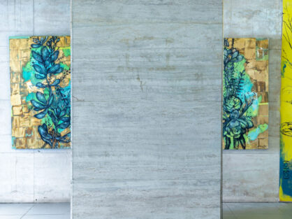 El mural en su mayoria va a ser realizado en el color tendencia 2025 de alba que se llama curry dorado con unos toques de color de la paleta del origen, realizado en fondo de color y dibujo encima que es lo que mas me caracteriza y siguiendo con la esteica del mural que realicé en foa 2022 cobrando una identidad de obra. sobre la placa de Travavertino, no voy a pintar si no, que voy montar una obra realizada en chapa de hierro calada y pintada en dorado. Siendo esta última, resultado de transitar el camino, un florecimiento o un renacer.