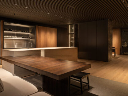 La flexibilidad fue otro concepto clave del proyecto. Puertas escamoteables, sumado a electrodomésticos panelables, ocultan las funciones de la cocina en caso de querer un espacio visualmente más limpio o formal, pudiendo mutar de acuerdo a su uso. El ingreso y egreso al espacio se genera atravesando un pórtico de madera de roble, con gran espesor.