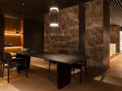 Se eligió la piedra Emperador Grey (Canteras del Mundo) para conformar volúmenes de mármol de piso a techo.