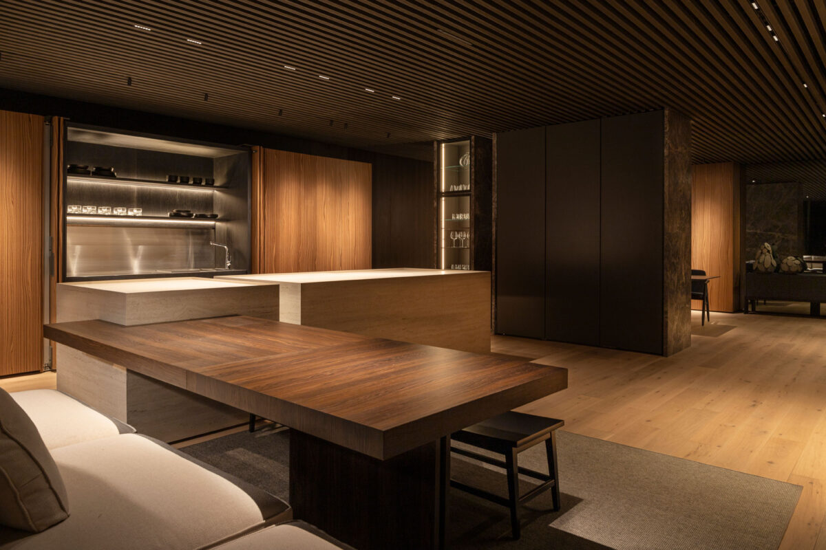 La flexibilidad fue otro concepto clave del proyecto. Puertas escamoteables, sumado a electrodomésticos panelables, ocultan las funciones de la cocina en caso de querer un espacio visualmente más limpio o formal, pudiendo mutar de acuerdo a su uso. El ingreso y egreso al espacio se genera atravesando un pórtico de madera de roble, con gran espesor.