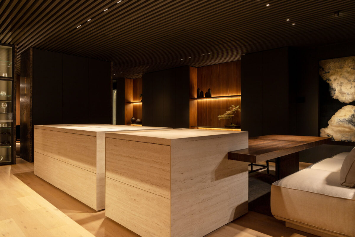 El sector central de preparado y cocción está compuesto por dos islas que simulan grandes bloques de piedra. Estos repiten el gesto de desfasaje entre sí al igual que los volúmenes de mármol que dividen a la cocina del comedor principal.