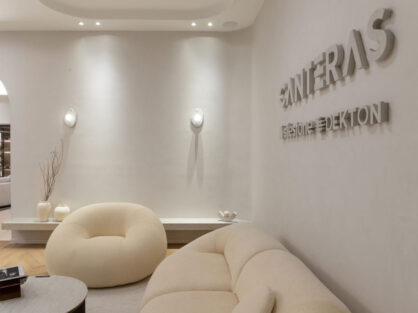 En el ala izquierda se propuso un espacio de living para generar un ambiente más chill y cálido que remita la sensación de hogar. En este ambiente se utilizó el recurso del piso de Dekton a modo de alfombra para generar límite visual. Completa la composición la piedra Cuarcita embutida en el revestimiento como elemento de arte y exhibición.