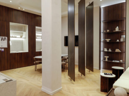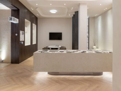 En el ala derecha, planteamos un espacio “Atelier estudio”, con una amplia mesa de reunión que permite a la marca a recibir clientes y profesionales. Como apoyo a esta función, en uno de los laterales del espacio generamos un revestimiento símil madera con espacio de guardado y nichos que conforman The Bar & Coffee Station materializados en Dekton.