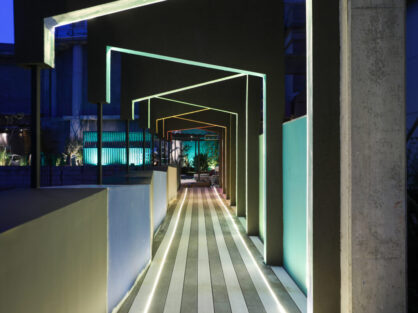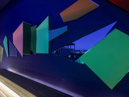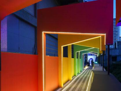Ocho arcos irregulares, una baranda escultórica y un gran mural conforman un recorrido sensorial que invita a vivenciar colores, texturas y materiales, dispuestos en capas superpuestas y entrelazadas, que juntos narran historias que celebran la diversidad, la memoria y la fusión de lo abundante y lo imperfecto.