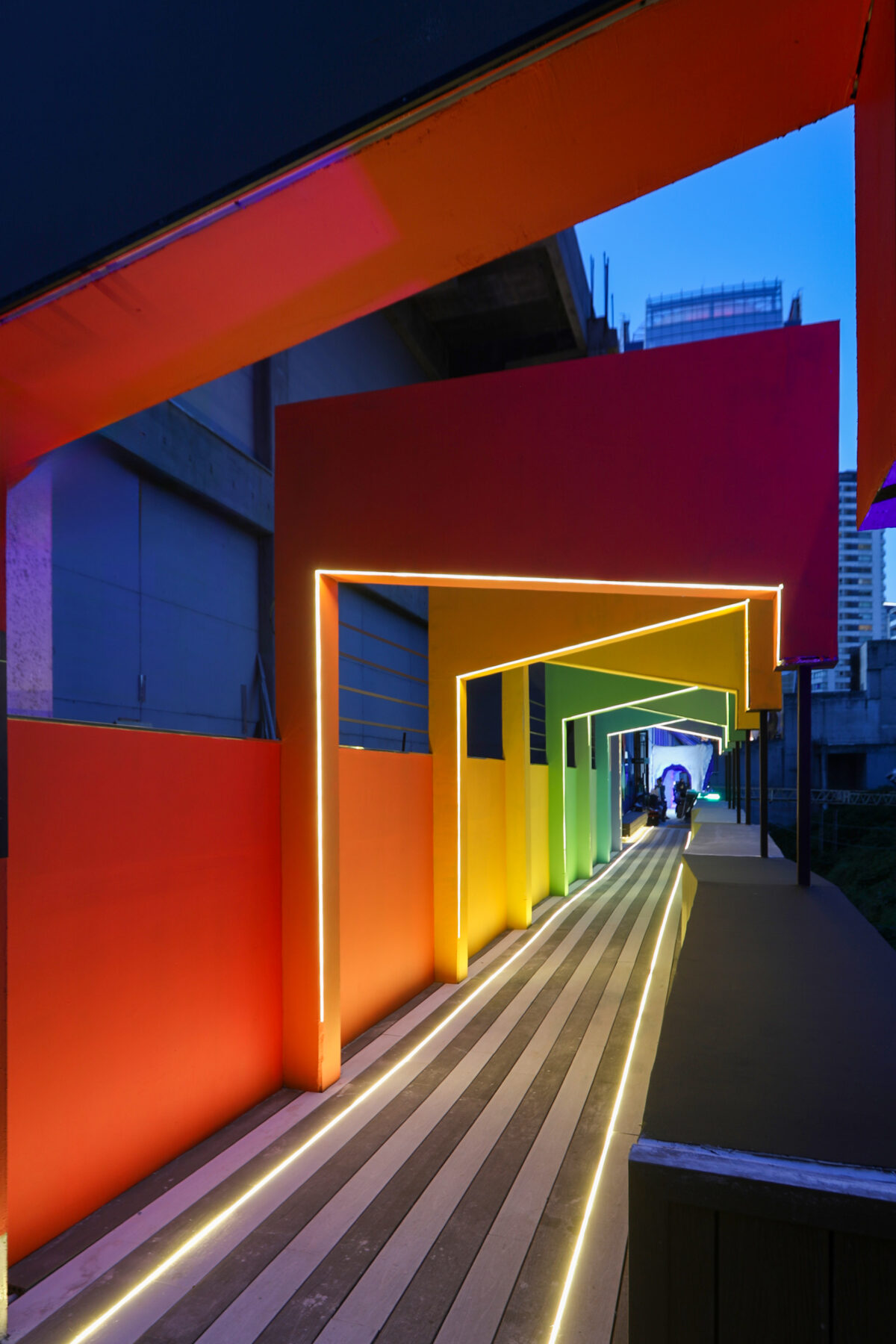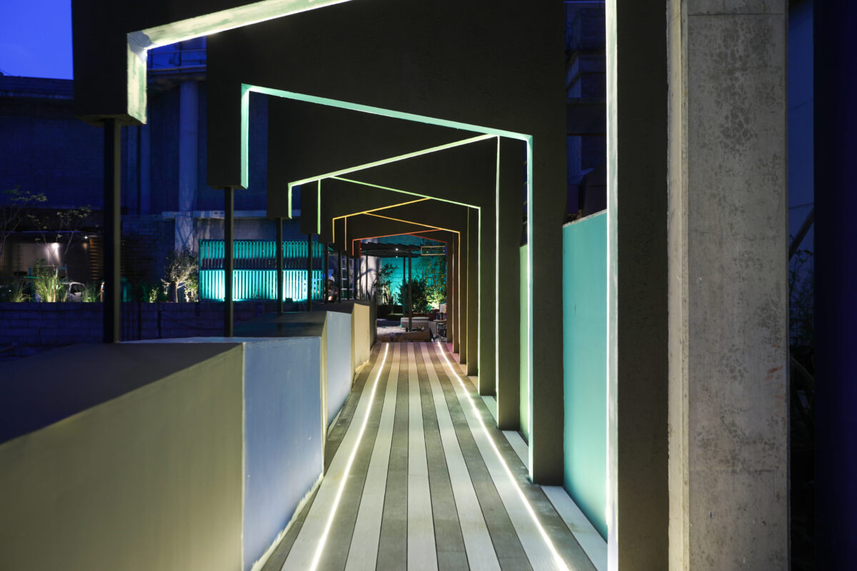 Ocho arcos irregulares, una baranda escultórica y un gran mural conforman un recorrido sensorial que invita a vivenciar colores, texturas y materiales, dispuestos en capas superpuestas y entrelazadas, que juntos narran historias que celebran la diversidad, la memoria y la fusión de lo abundante y lo imperfecto.