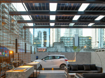 Bajo la pérgola solar, tradición y tecnología se entrelazan para dar forma a un refugio urbano. El futuro de la movilidad se integra a la serenidad del hogar: los autos ya no esperan, habitan.