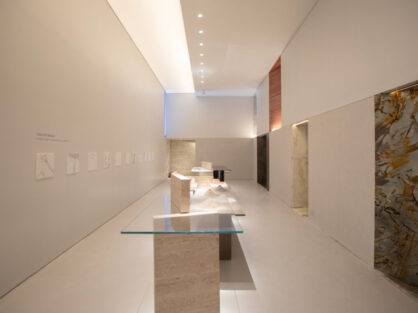 Acceso y recorrido: una sutil apertura conduce al visitante a un pasaje lineal de silencio. Desde allí se despliega un recorrido longitudinal donde muros blancos horadados dejan entrever ónix, mármoles y cuarcitas. Cada abertura convierte la piedra en obra de arte, desplegando mapas geológicos, vetas, halos y destellos translúcidos.
