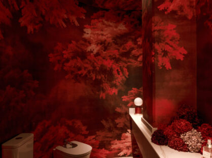 La envolvente neutra de porcelanato en gris, grafito y terracota, los colores de la ciudad, convive con una paleta de colores vibrantes en papeles de pared, muebles y esculturas.