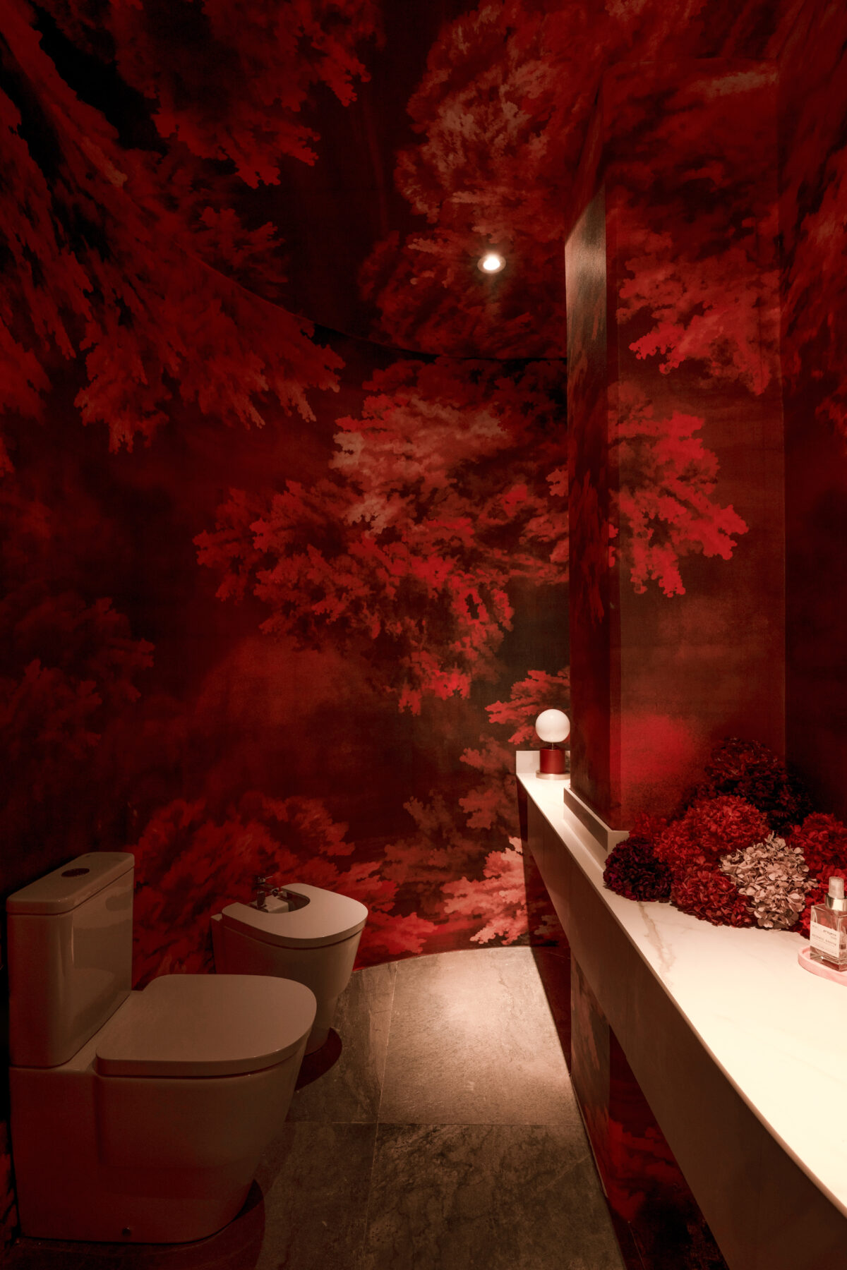 La envolvente neutra de porcelanato en gris, grafito y terracota, los colores de la ciudad, convive con una paleta de colores vibrantes en papeles de pared, muebles y esculturas.