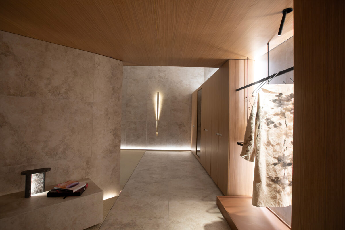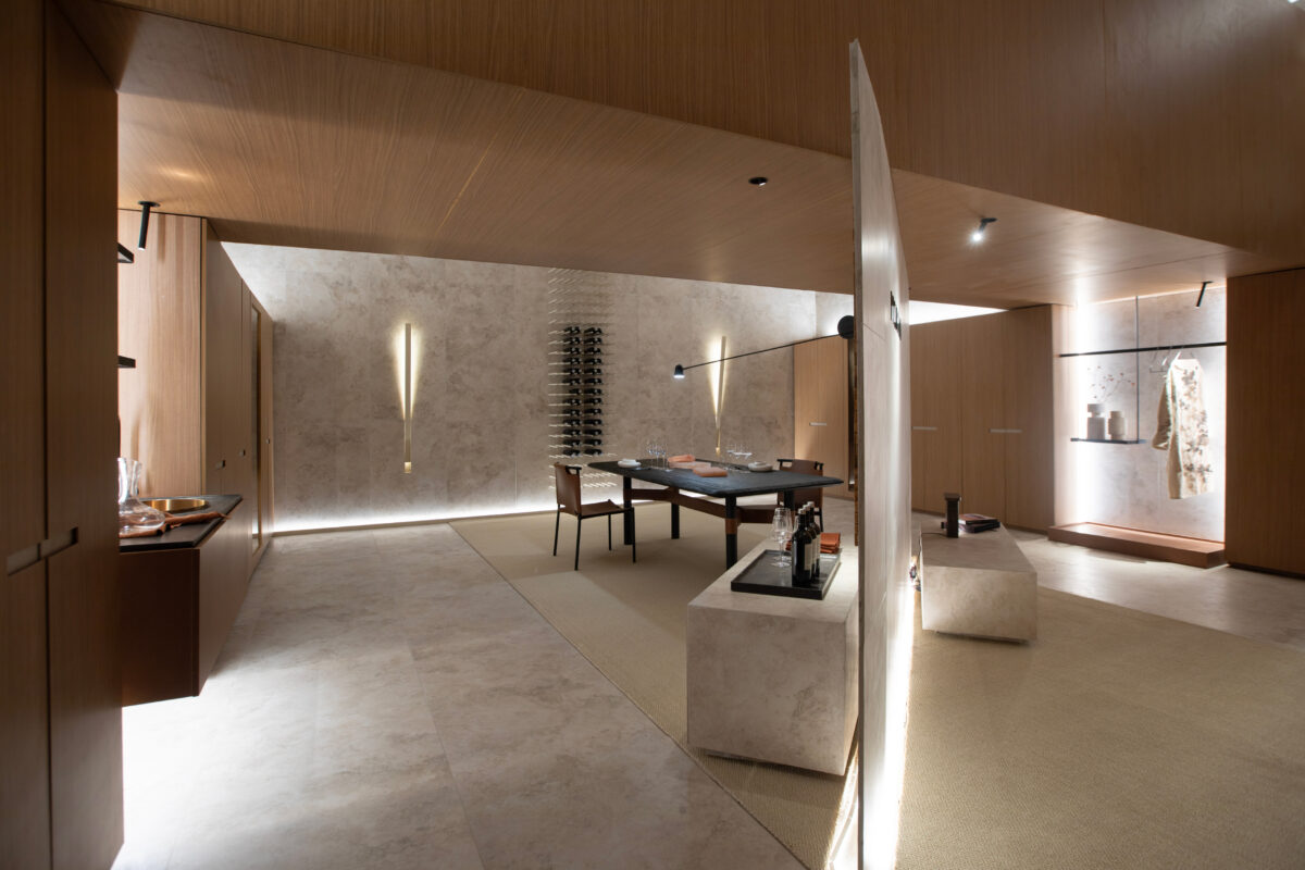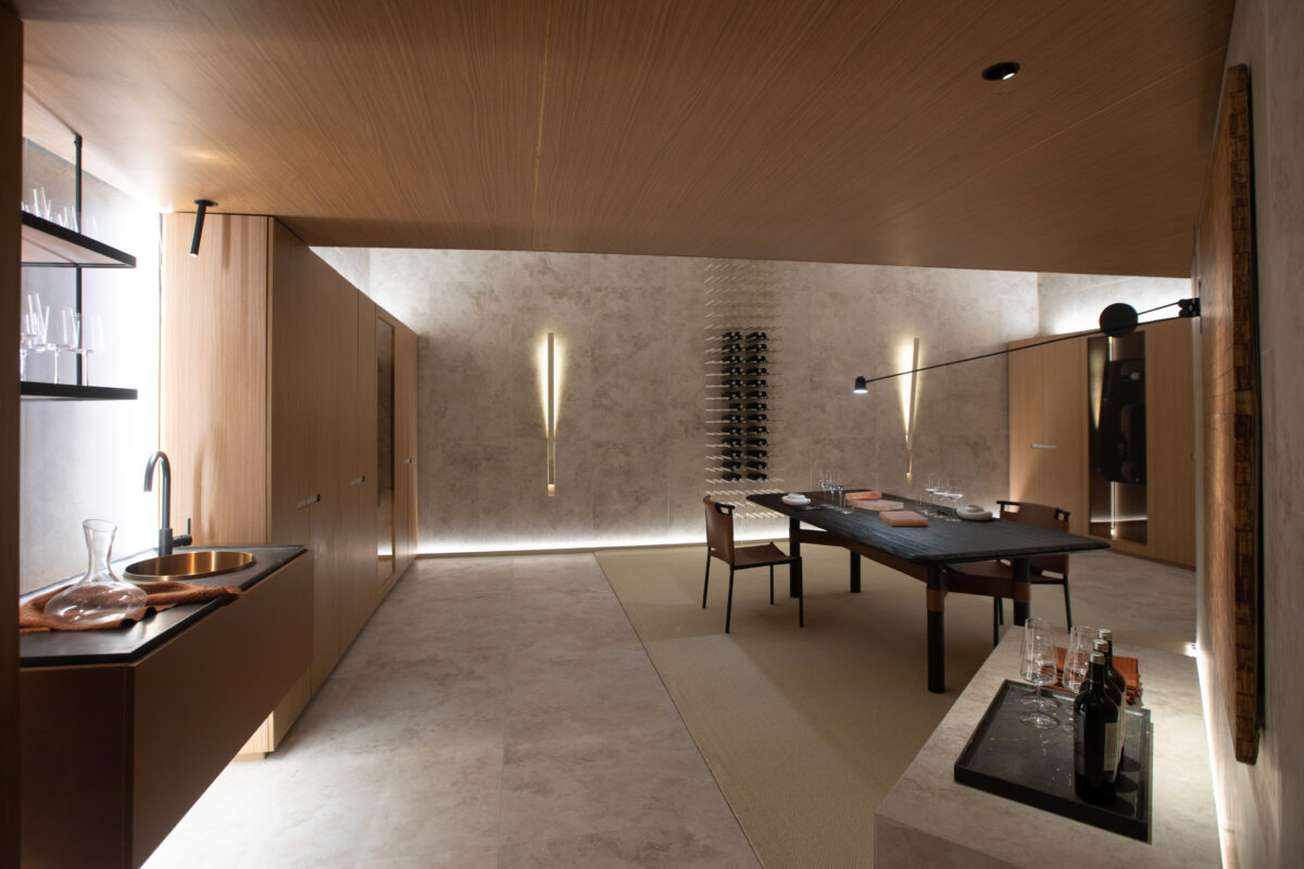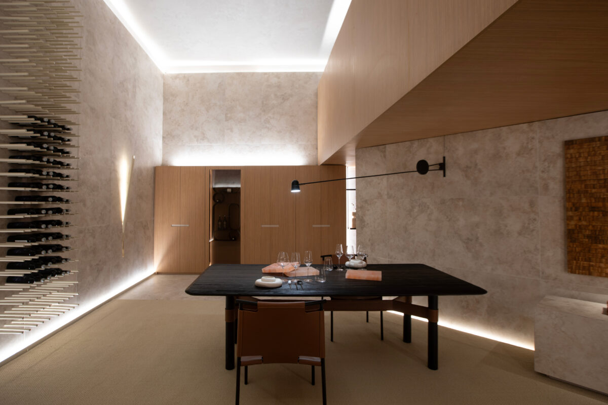 El muro diagonal de travertino guía el recorrido, organiza el espacio y a su vez invita a detenerse: una recepción como preámbulo necesario para prepararnos para lo que sigue. Las 270 ménsulas que sostienen botellas se elevan con imponencia, como una biblioteca líquida. Allí el vino no solo se guarda, se exhibe como conocimiento y relato.