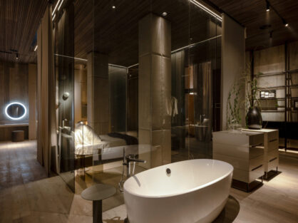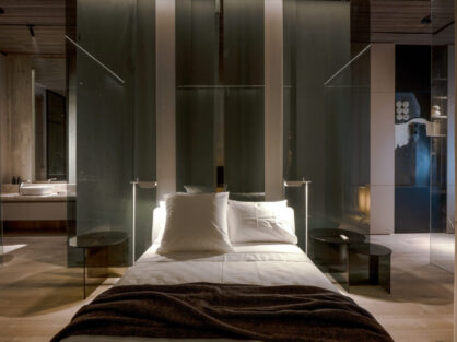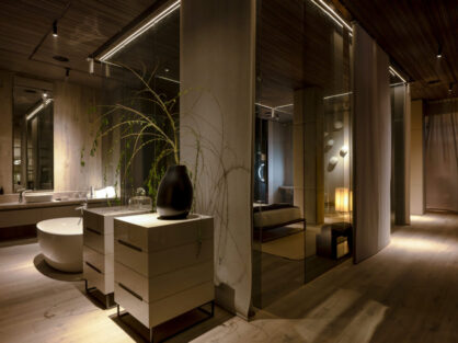 La materialidad sostiene esta búsqueda: maderas claras, texturadas y sofisticadas conforman una piel continua que recorre el perímetro del espacio, generando una atmósfera calma, envolvente y cálida. Los acentos en tonos más oscuros se utilizan con precisión para marcar focos de atención y jerarquizar elementos. El espacio narra la intimidad de una pareja cosmopolita, que luego de recorrer el mundo elige el descanso con sentido como nuevo lujo. La experiencia busca trascender la función, apelando a una sensibilidad contemporánea donde diseño, bienestar y contemplación conviven.