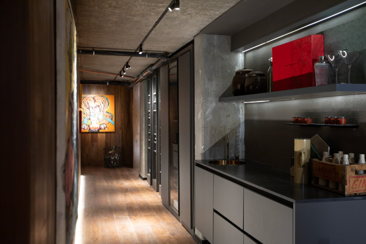 Detrás del área de cocina, un corredor acompaña el recorrido hacia una bodega de diseño que incluye su propia mesada de servicio. El conjunto, resuelto en tonos oscuros y acabados mate, potencia el brillo de las botellas y revestimientos mediante una iluminación puntual que resalta cada detalle.