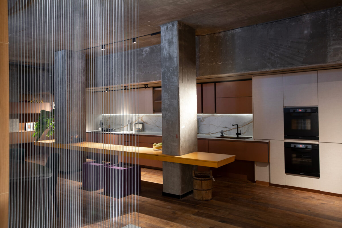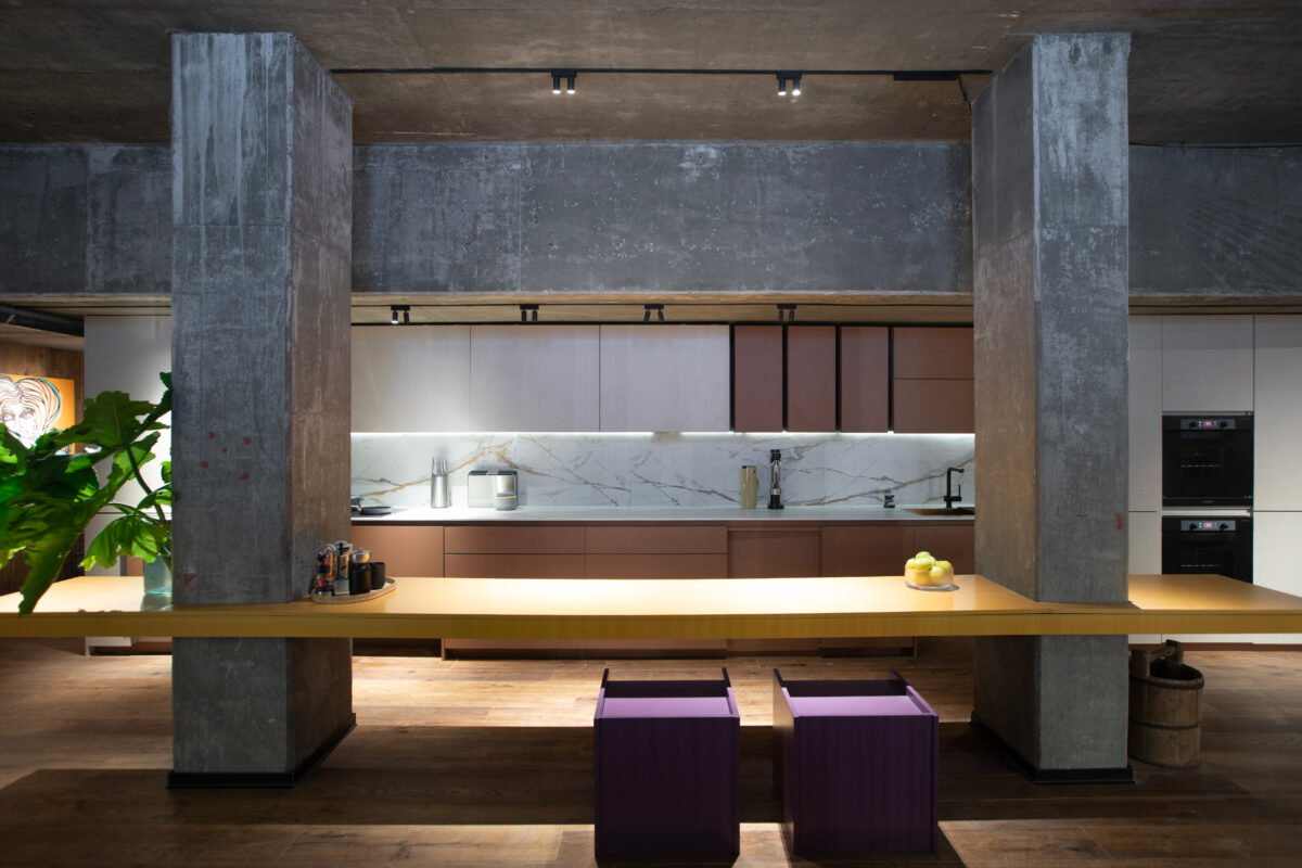 El espacio se estructura en torno a una gran cocina central, corazón funcional y escénico del ambiente.