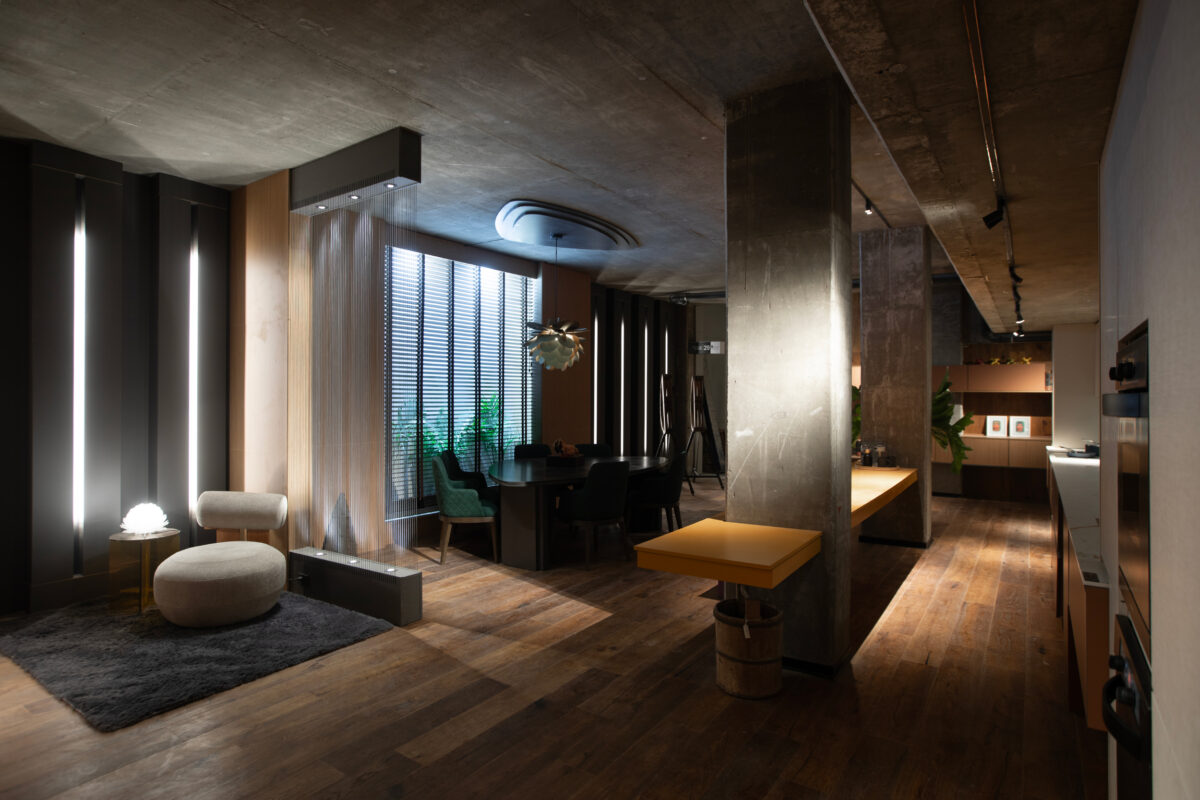 Como centro de la escena se impone una mesa escultórica, acompañada por una luminaria de gran presencia, que reúne a los comensales en un entorno pensado para observar, compartir y degustar. La configuración favorece la interacción entre el anfitrión y sus invitados, generando una experiencia sensorial completa.