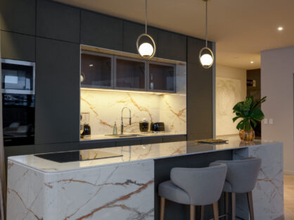 La cocina, escultórica y curvilínea, luce vetas potentes como pieza central.
